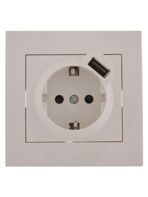 Розетка скрытой установки с заземлением и USB-разъемом белая от Lezard (арт. 703-0202-181) предназначена для одновременного питания бытовых устройств через евророзетку и зарядки гаджетов через USB-порт. Подходит для установки в жилых помещениях, офисах и общественных зонах с внутренней проводкой.