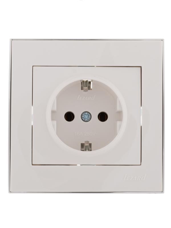 Розетка с заземлением керамика белая с боковой вставкой хром стандарта SCHUKO от Lezard (арт. 703-0225-122) - надёжная скрытая розетка для постоянного подключения бытовых и промышленных устройств с заземлением, соответствует стандарту SCHUKO и рассчитана на работу в условиях умеренного климата.