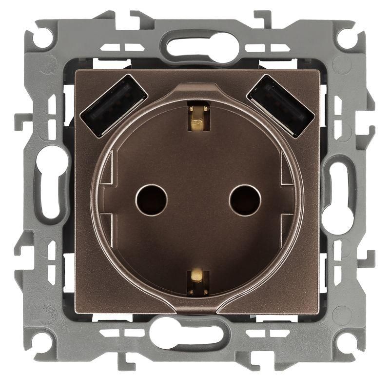 Розетка 2P+E 16A-250В, штор. с 2xUSB 5В-3А, Эра12, бронза (10/100/2000) 12-4109-13 - Б0047847