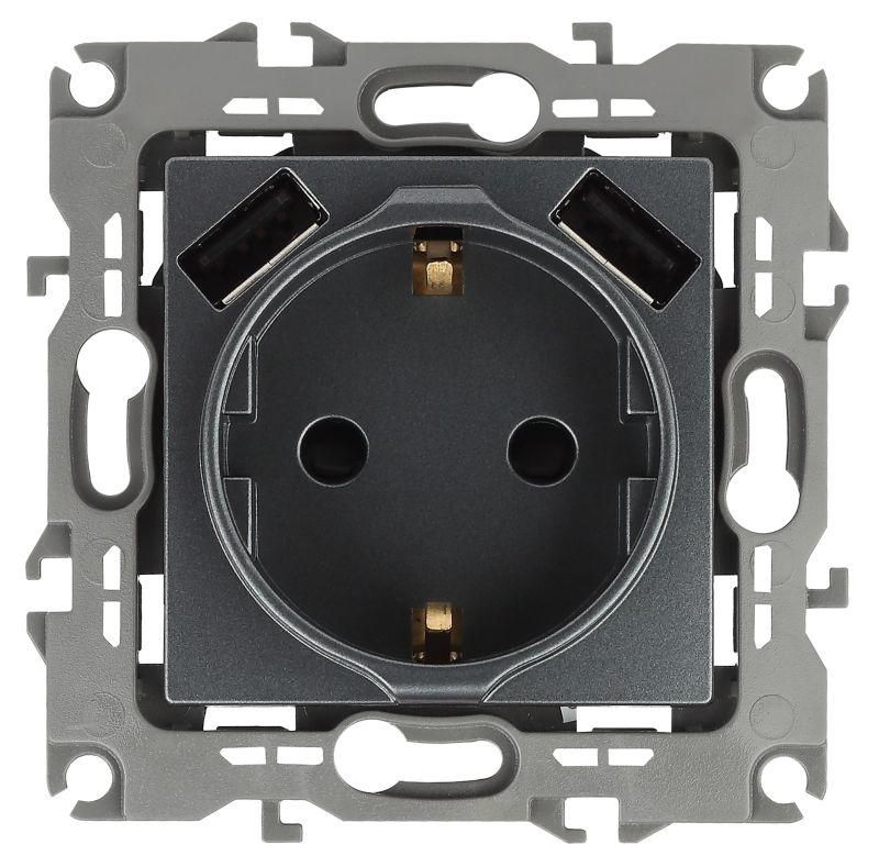 Розетка 2P+E 16A-250В, штор. с 2xUSB 5В-3А, Эра12, графит (10/100/2000) 12-4109-12 - Б0047846