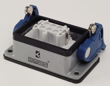 Розетка 6-полюсная 16А с 2 фиксаторами для панели, металлический кожух с гнездом для монтажа на перегородке, нижний ввод, степень защиты IP65 от компании EMAS (артикул ebm06pm42) предназначена для надёжного подключения оборудования в условиях повышенной запылённости и влаги - например, на производстве, в цехах или на открытых площадках.