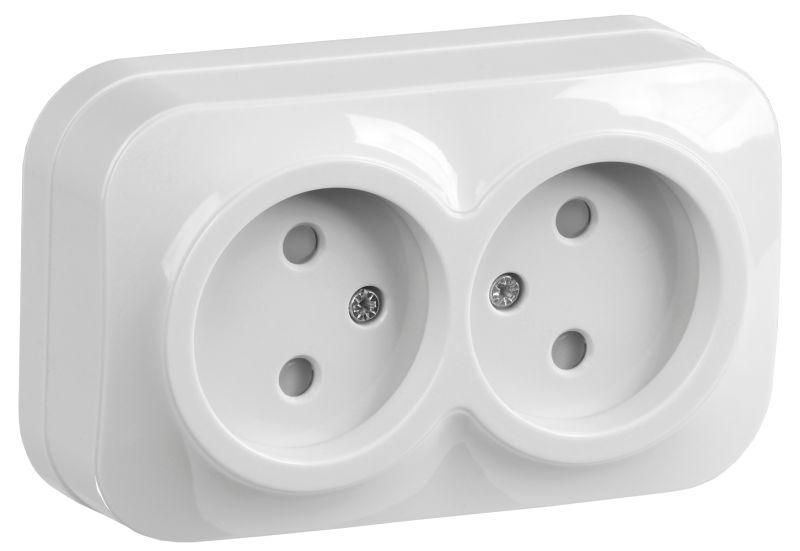 Розетка двухместная наружная без заземления с защитной шторкой 10А белая используется там, где нет необходимости в заземлении - например, для питания маломощных устройств: светильников, зарядных устройств, радиоприёмников, уличных фонарей или оборудования в гаражах, сараях, на террасах. Подходит для установки в жилых домах, дачах, офисах и торговых точках со стильной отделкой в духе лофт. Материал корпуса и глянцевая поверхность позволяют легко интегрировать её в интерьеры с деревянными или минималистичными элементами.