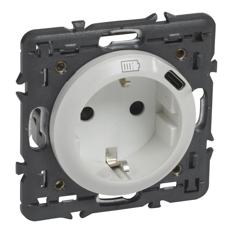 Розетка 2-м СП 2мод. Celiane 16А IP40 250В 2P+E комбинир. со встроен. зарядн. устройством USB C 1.5А 5В и суппортом с лиц. панелью бел. Leg 068119 Legrand