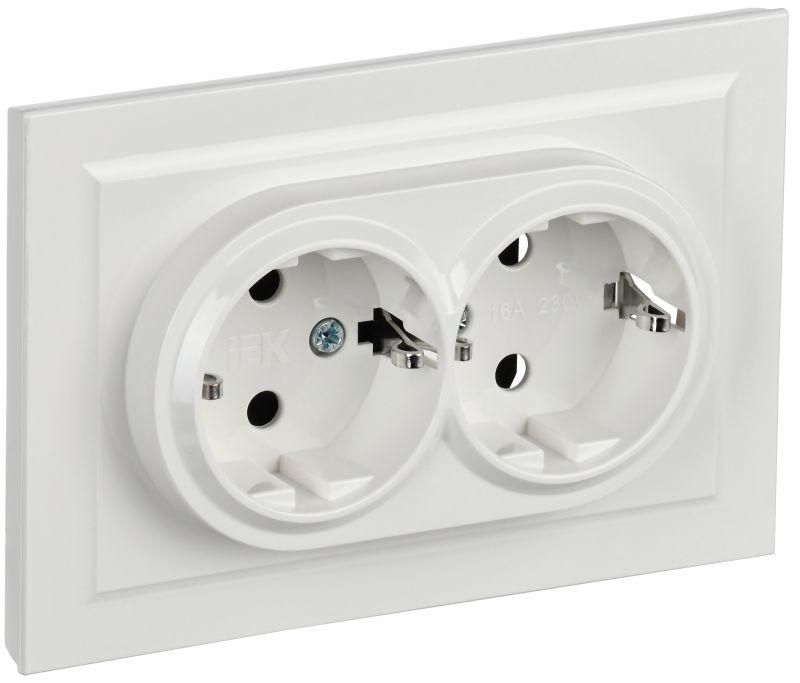 Розетка двойная с заземлением без защитных шторок 16А в сборе белая РС12-3-БрБ от бренда IEK - это надёжная силовая розетка серии BRITE для внутренней установки в помещениях с нормальной влажностью. Подходит для подключения бытовых и профессиональных устройств мощностью до 3,6 кВт, обеспечивает безопасное заземление и совместима со стандартными вилками Евро-типа.