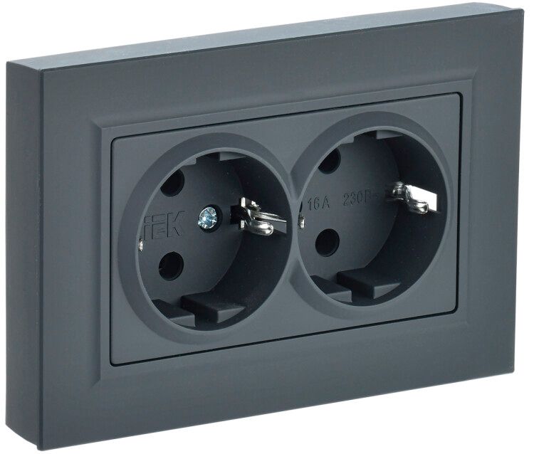Розетка двойная с заземлением с защитными шторками 16А в сборе РСш12-3-БрГ графит - это скрытый силовой контакт для бытовых и офисных помещений, обеспечивающий безопасное подключение двух устройств одновременно. Выполнена в серии BRITE от бренда IEK, соответствует требованиям долговечной эксплуатации и совместима со стандартными монтажными коробками.