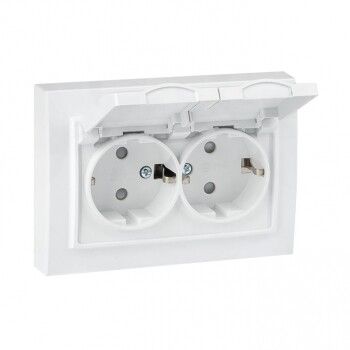 Розетка 2-местная с заземлением, защитными шторками, крышкой, 16А, IP44, белая, СП совместима с большинством стандартных пластиковых монтажных коробок глубиной от 40 мм. Крепление осуществляется с помощью распорных лапок и двух винтов - они обеспечивают плотную фиксацию без перекоса. Для монтажа требуется отвертка и подготовленная ниша в стене. Подключение проводов - только винтовое; не допускается использование клемм WAGO или других бесвинтовых систем. Максимальный сечения провода - 2,5 мм2 (медный).