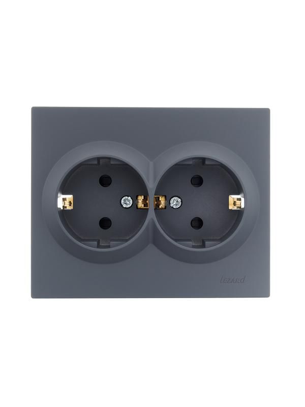 Розетка 2-местная с заземлением со шторками из полибутилентерефталата (ПБТ) графит от бренда LEZARD, артикул 742-3400-178b - надёжный вариант для установки в бытовых и профессиональных условиях, где важна безопасность и долговечность корпуса. Графитовый цвет и материал ПБТ обеспечивают устойчивость к механическим нагрузкам и химическим воздействиям.