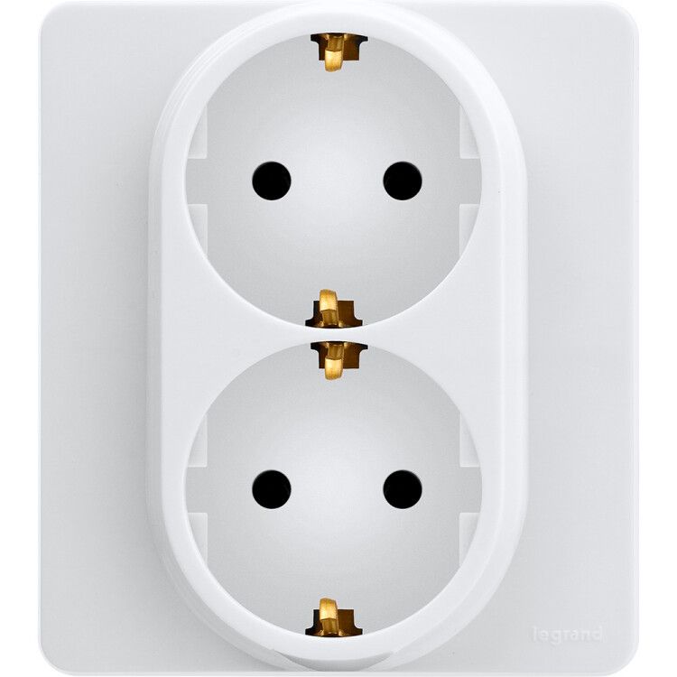 Розетка Legrand Inspiria 673750 - двойная розетка с заземлением по немецкому стандарту, рассчитанная на ток до 16 А и напряжение 250 В. Подходит для скрытого монтажа в помещениях с заземленной проводкой, позволяет экономично разместить два устройства питания в одном установочном отверстии.