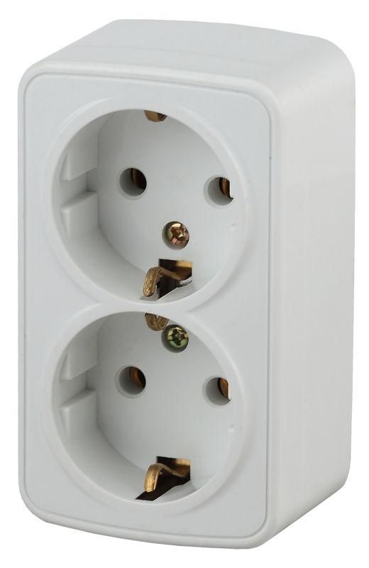 Розетка 2х2P+E Schuko, 16А-250В, IP20, открытая установка, белый используется для подключения электрооборудования с штепсельными вилками стандарта Schuko (CEE 7/4). Подходит для установки в жилых, офисных и производственных помещениях - например, рядом с оборудованием на стене, в мастерских, на участках с постоянным доступом к сети. Оба поста работают независимо, что позволяет одновременно использовать два устройства.