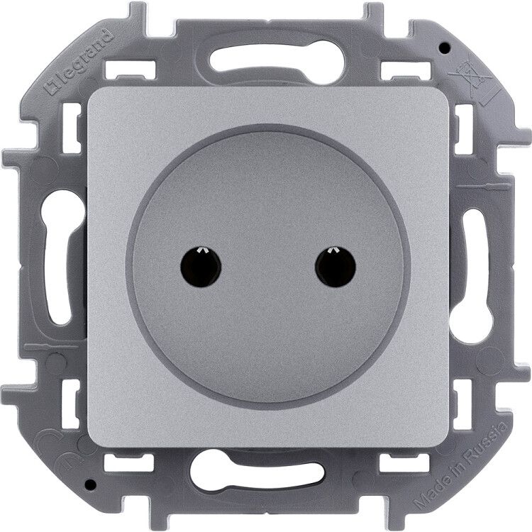 Розетка штепсельная 1-местная 16 А 250 В без заземления без рамки алюминий от Legrand - устройство для подключения бытовых приборов в старых сетях без защитного заземления. Артикул 673712 относится к серии INSPIRIA и рассчитана на скрытый монтаж в стене.