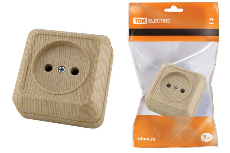 - Розетка 2-полюсная открытой установки IP20 10А, сосна, серия Ладога от TDM ELECTRIC - хороший выбор для реставрационных работ, но не для новых проектов с повышенными требованиями к безопасности.