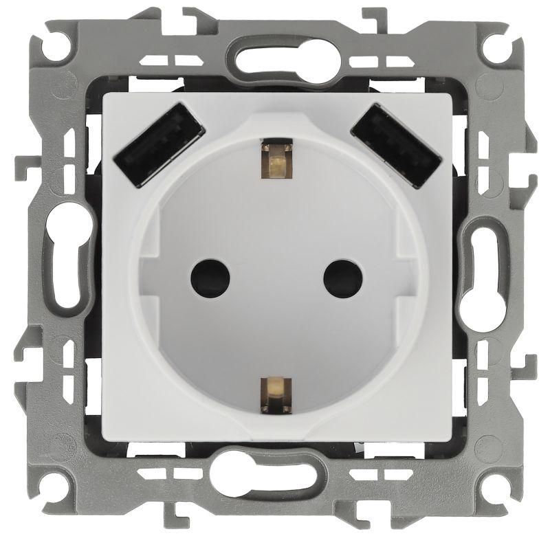 Розетка 2P+E 16A-250В, штор. с 2xUSB 5В-3А, Эра Elegance, белый 14-4109-01 - Б0047867