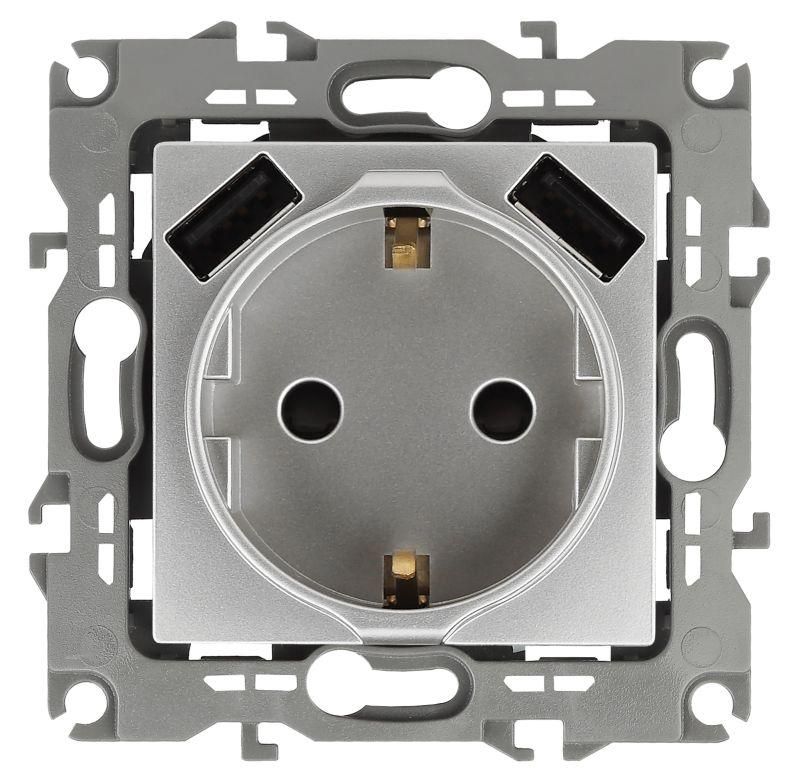 Розетка 2P+E 16A-250В, штор. с 2xUSB 5В-3А, Эра12, алюминий (10/100/2000) - Б0047842