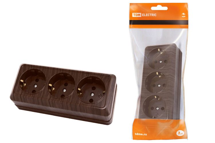 Розетка 3-х местная горизонтальная 2П+3 открытой установки IP20 16A бук "Ладога" | SQ1801-0326 TDM