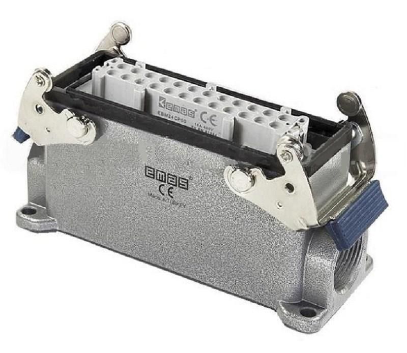 Розетка металлическая 24 полюса 16А с 4 фиксаторами, 2 ввода для панели, IP65, с гнездом, двусторонний ввод (PG 21) от бренда EMAS - надёжный соединитель для жёстких условий эксплуатации, где требуется устойчивость к пыли, влаге и механическим воздействиям. Артикул ebm24pd27 предназначен для подключения оборудования через панель управления, обеспечивая безопасную передачу сигнала и питания.