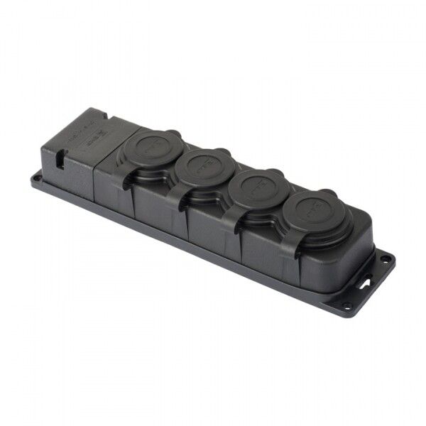 Розетка четырехместная с защитными крышками каучуковая 230В 2P+PE 16A IP44 EKF RPS-020 - надёжная точка подключения для мощных устройств в сложных условиях. Подходит для промышленного оборудования, временных площадок и уличных установок благодаря защищённому корпусу из каучука.