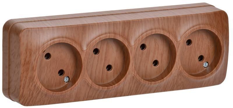 Розетка четырехместная наружная без заземления дуб 10А соответствует требованиям ГОСТ Р 51324.1–2011 для электроустановочных изделий. Отсутствие заземления делает её непригодной для питания оборудования класса I (с металлическими корпусами, требующими зануления). Применение в местах с риском поражения током - запрещено.