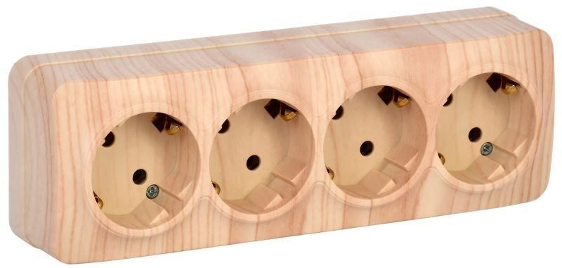 Розетка четырехместная наружная с заземлением и защитным контактом 16А сосна используется для подключения электрооборудования в местах с повышенной влажностью или внешним воздействием - на террасах, верандах, гаражах, производственных площадках и в загородных домах. Подходит для стилей лофт и деревенский дизайн благодаря имитации древесины. Применяется там, где нужна одновременная работа нескольких приборов: светильники, насосы, перфораторы, зарядные устройства.