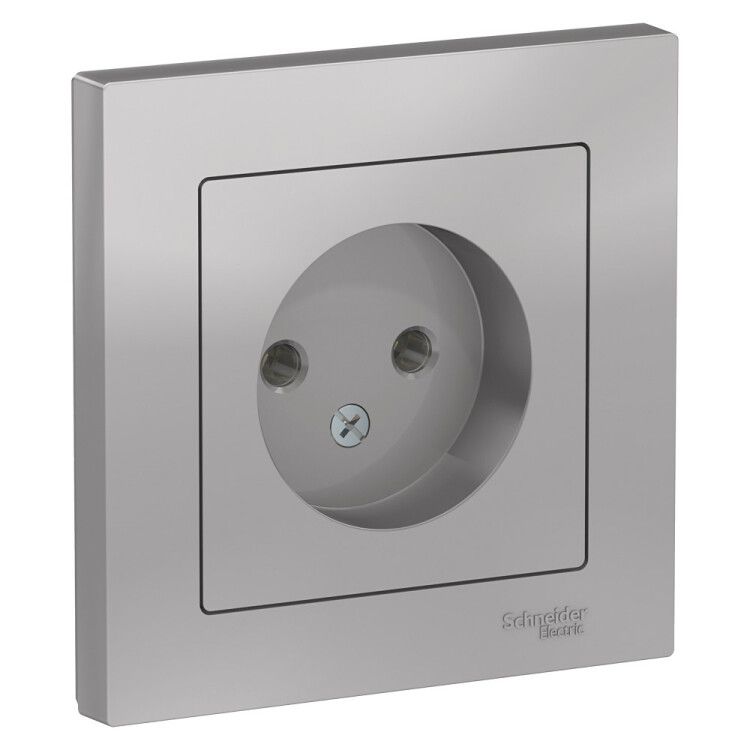 Розетка без заземления 16А в сборе алюминий, серия SE используется там, где не требуется подключение защитного провода - например, для питания маломощных приборов двойной изоляции: светильники, зарядные устройства, радиоприёмники, некоторые типы электроинструментов. Подходит для жилых помещений, офисов, административных зданий и объектов с ограниченными требованиями к защите от поражения током. Монтируется исключительно в скрытую проводку внутри стен.