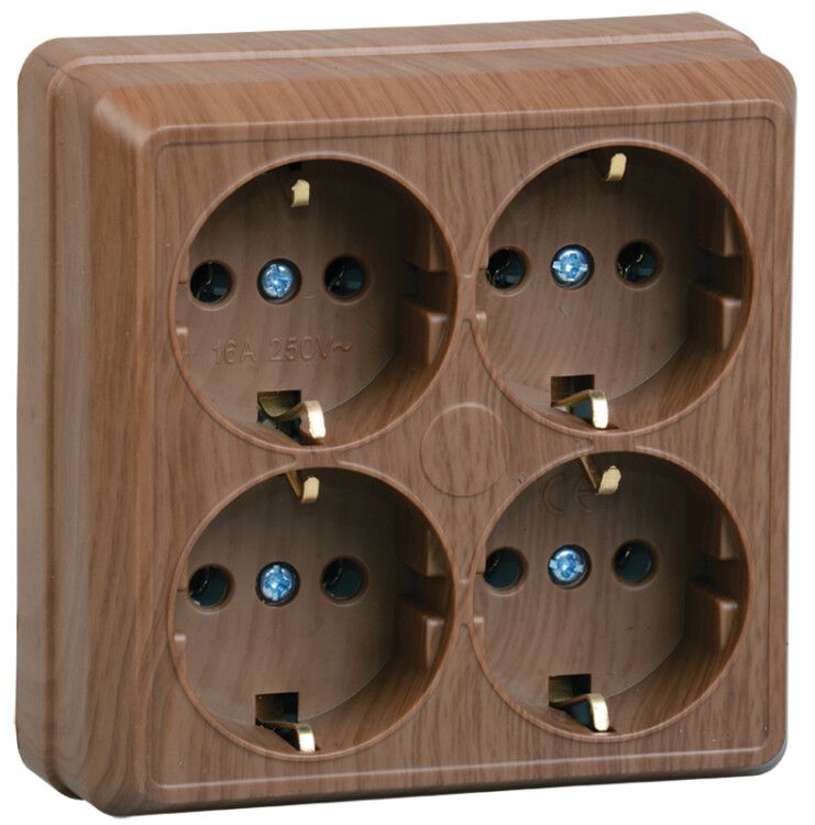 Розетка четырехместная наружная с заземлением 16А РС24-3-ОД дуб совместима со всеми типами евровилок (Schuko, Type F) и плоскими вилками стандарта CEE 7/16. Для монтажа используется винтовое крепление - необходимо просверлить отверстия в стене и закрепить изделие саморезами. Кабели сечением до 2,5 мм2 заводятся в клеммы, которые затягиваются отвёрткой. Обязательно подключать заземляющий проводник к соответствующему контакту - это снижает риск поражения током. Монтаж допускается только на сухих поверхностях, так как степень защиты IP20 не предусматривает защиту от влаги.
