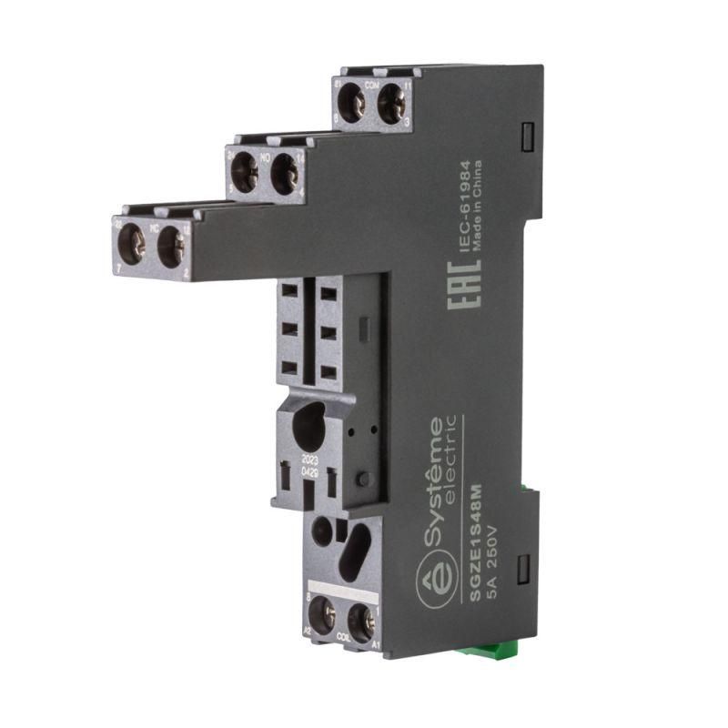 Розетка для реле 2 нормально-открытых контакта (2НО) со скобой, тип separate SE от бренда Systeme Electric (артикул sgze1s48m) предназначена для быстрой замены и надёжного подключения реле типа SXM 2СО в системах автоматизации. Она обеспечивает механическую фиксацию и электрический контакт через винтовые зажимы на DIN-рейке.