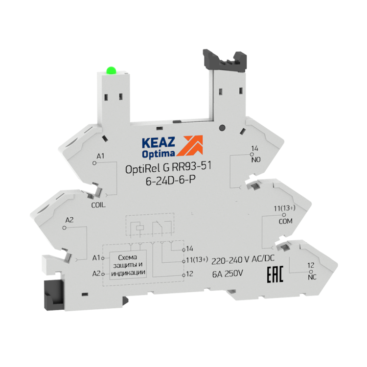 Розетка для реле OptiRel G RR93-51-12-24U-6-P и RR93-01-6-24D-6-V от КЭАЗ - это компактное устройство для быстрой установки и подключения промежуточных реле серии OptiRel G на DIN-рейку. Обеспечивает надёжное электрическое соединение между реле и внешней цепью, упрощает замену и обслуживание.