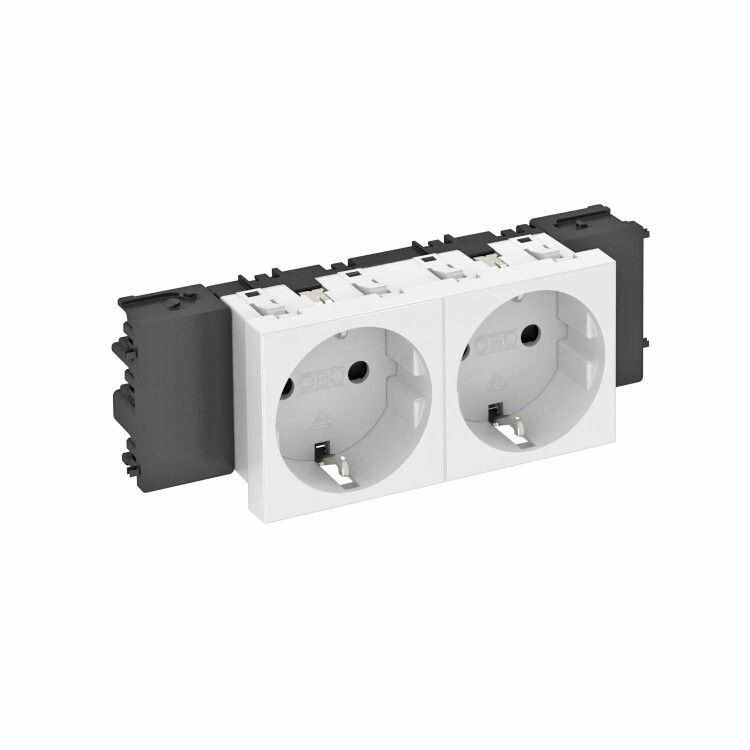 Розетка двойная 0° с заземлением и защитными шторками, 16А 250В, белая, Modul45connect - это внутренняя розетка с двумя выходами, рассчитанная на бытовую и профессиональную нагрузку до 16 А. Произведена компанией OBO BETTERMANN, артикул 6120362, предназначена для монтажа в стандартные распределительные коробки и кабель-каналы Rapid 45.