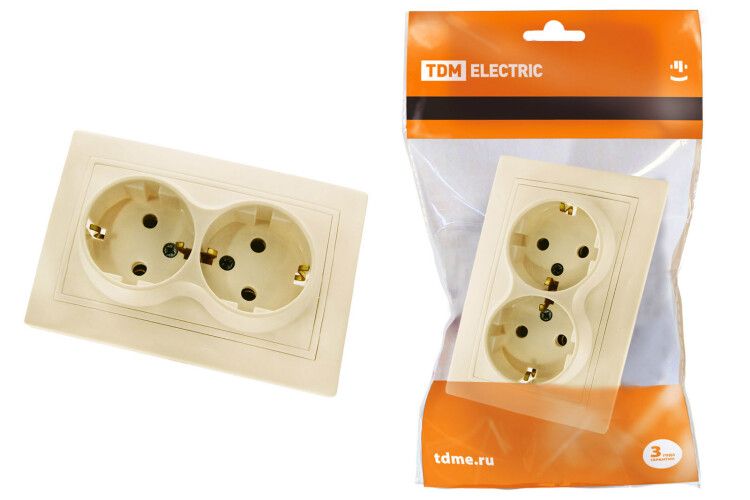 Розетка двойная 2П+З 16А 250В слоновая кость от TDM ELECTRIC - это надёжное решение для скрытой установки в жилых и общественных помещениях. Устройство обеспечивает безопасное подключение двух бытовых приборов с заземлением, выполнено из термопласта без галогенов и соответствует требованиям IP20.