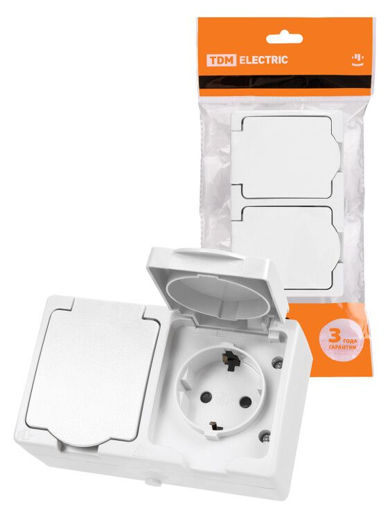 Розетка двойная 2П+З (горизонтальная) открытой установки IP54 16А белая от TDM ELECTRIC - надёжное решение для подключения бытовых и промышленных устройств в условиях высокой влажности, запылённости и наружной среды. Артикул sq1803-1008 обеспечивает безопасную работу с нагрузкой до 16 А, имеет встроенный заземляющий контакт и защищён от пыли и брызг воды.