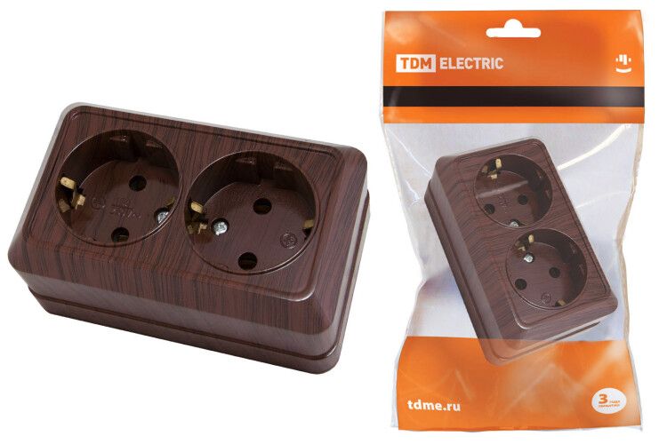 Розетка двойная 2П+З открытой установки IP20 16А, бук предназначена для постоянного подключения бытовой и офисной техники в местах, где невозможно или нецелесообразно использовать скрытую проводку. Подходит для установки на деревянные, гипсокартонные или другие несгораемые поверхности. Часто применяется в частных домах, дачах, бытовках, больницах, школах и других объектах с низкой степенью влагозащищённости.