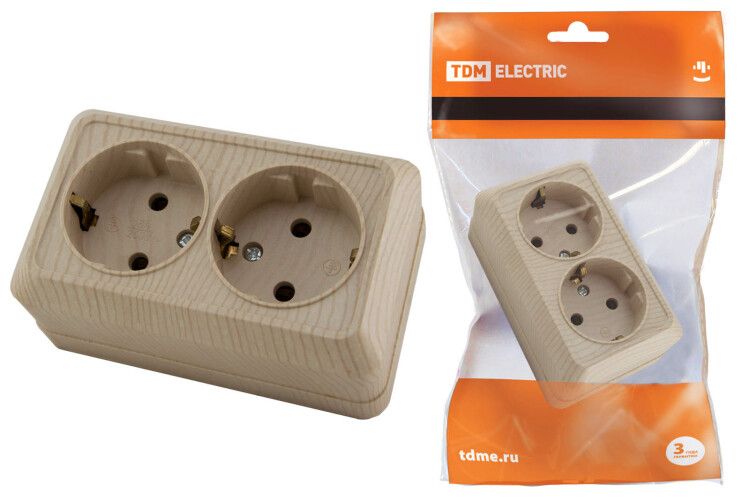 Розетка двойная 2П+З открытой установки IP20 16А, сосна, серия Ладога изготовлена из самозатухающего АБС-пластика, который не распространяет горение. Соответствует основным требованиям безопасности для бытовых розеток в РФ. Отсутствуют данные о сертификатах по ГОСТ или IEC - рекомендуется проверить наличие документации у поставщика перед использованием в ответственных объектах. Защитный контакт реализован в виде металлических пластин внутри гнезд - обеспечивает надёжное заземление при использовании трёхконтактных вилок.