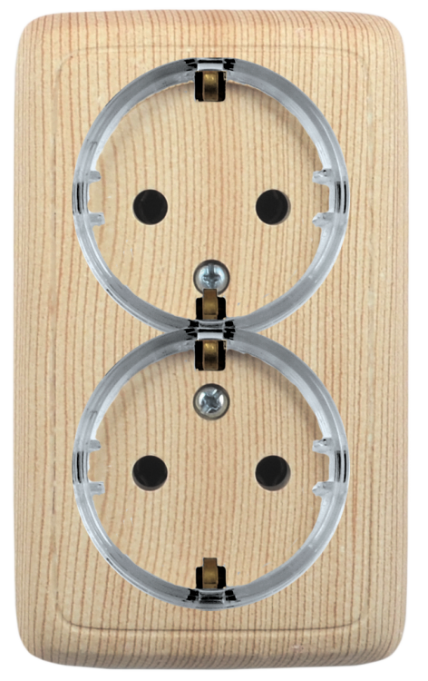 Розетка открытой установки двойная с заземляющим контактом цвет сосна от бренда HEGEL, артикул ра16-181-02 - это прочная, нестандартно оформленная силовая розетка с заземлением, предназначенная для настенного монтажа в помещениях с повышенной влажностью или в условиях, где важна эстетика натурального дерева. Подходит для бытовых и промышленных объектов с однофазной сетью 220 В.