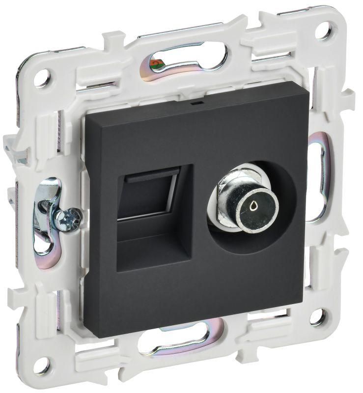 Розетка двойная TV+RJ45 кат.5E графит совместима с универсальным типоразмером механизмов 45×45 мм. Устанавливается в стандартную круглую или прямоугольную монтажную коробку глубиной не менее 40 мм. Клеммы самозажимные - позволяют фиксировать провода без зачистки и намотки, что снижает риск плохого контакта. Цветная маркировка на контактах (белая для TV, синяя для LAN) ускоряет подключение и исключает ошибки при монтаже. Для работы требует предварительной прокладки двух кабелей: коаксиального (F-коннектор) и витой пары (RJ45).