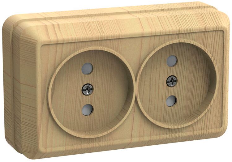 Розетка 2-местная наружная без заземления 10А открытого монтажа сосна устанавливается на стену с помощью винтового крепления. Для монтажа нужны два самореза (не входят в комплект). Кабели подключаются через винтовые зажимы - важно не перегибать жилы и не допускать оголённых участков. Максимальное сечение кабеля - 2,5 мм2; более толстые провода не войдут. Напряжение питания - только 220–250 В переменного тока. Совместима с обычными двухштырьковыми вилками типа CEE 7/16 (Евро-вилки без заземления).