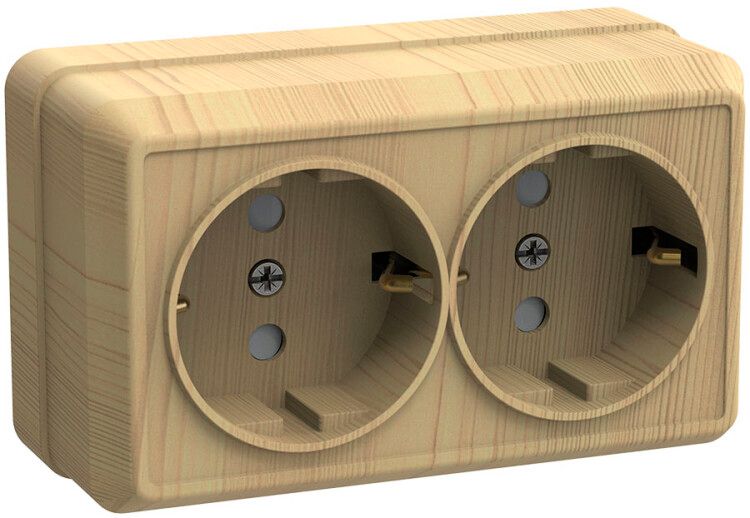 Розетка двойная наружная с заземлением 16А открытого монтажа сосна предназначена для подключения однопостовых электроприборов мощностью до 3,5 кВт (при 250 В и 16 А) в помещениях с нормальной влажностью. Подходит для установки на стенах в гаражах, мастерских, дачах, на улице под навесом - там, где требуется доступ к сети без скрытой проводки. Благодаря наличию заземления обеспечивает безопасную работу оборудования с металлическими корпусами: стиральных машин, сварочных аппаратов, электроинструментов.