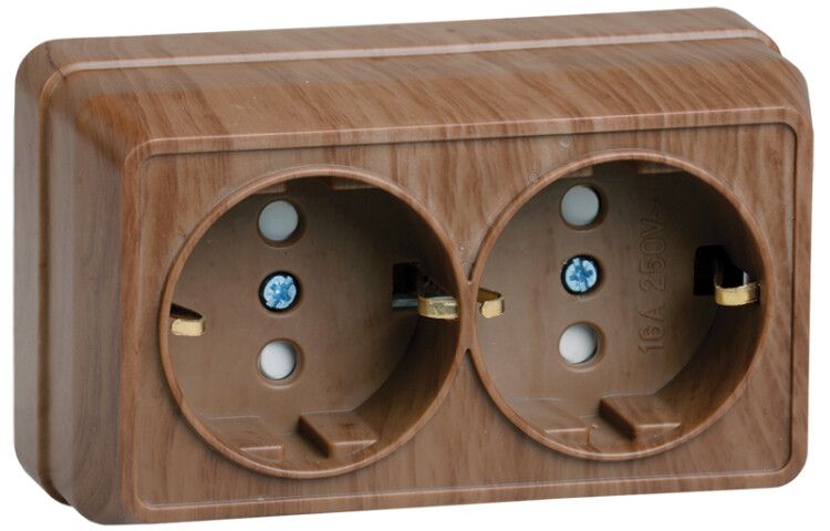 Розетка двухместная с заземляющим контактом с защитными шторками 16А открытая установка РСш22-3-ОД дуб предназначена для подключения однопостовых потребителей переменного тока напряжением до 250 В и частотой 50 Гц. Подходит для установки на стенах в жилых, офисных и производственных помещениях. Особенно эффективна там, где требуется подключение нескольких устройств одновременно - например, у рабочего места, на кухне, в мастерской или возле оборудования.