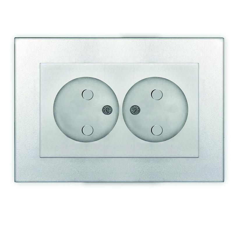 Розетка двухместная 16А 220В без заземления с защитными шторками в сборе серебристая (еврослот), механизм серии «Афина» от бренда Universal предназначена для подключения бытовых приборов в помещениях с нормальными условиями эксплуатации. Механизм совместим со скрытой проводкой и оснащён защитными шторками для повышения безопасности.
