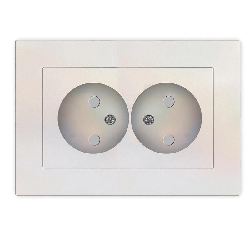 Розетка двухместная серия Афина 16А 220В без заземления с защитными шторками, жемчужный цвет, евростандарт - это скрытая розетка для внутренней проводки, подходящая для помещений с нормальной влажностью и без требований к заземлению. Бренд Universal, артикул a0048-obr, сочетает минимализм дизайна и надёжную механическую конструкцию.