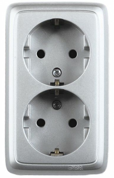Розетка двойная наружная с заземлением со шторками изоляционной пластиной серебро - РА16-154-06 HEGEL