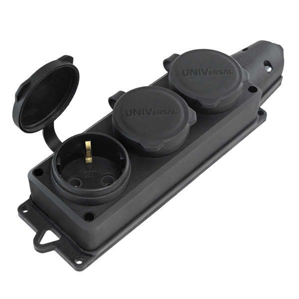 Колодка удлинителя 3-метровая 1-фазная с заглушками из каучука, розетка трехместная с заземлением IP44 имеет вилку стандарта Schuko (CEE 7/4) и три розетки с заземляющими контактами. Для подключения используйте кабель сечением не более 2,5 мм2 - большие сечения не войдут в зажимы. Монтаж не требует специальных инструментов: достаточно вставить вилку в стенную розетку и подключить оборудование. Крышки на розетках легко открываются одной рукой, что удобно при работе в перчатках.