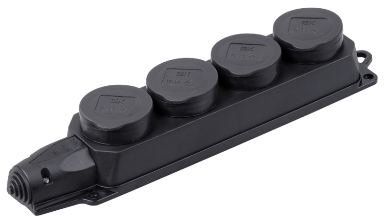 Колодка удлинителя четырехместная с защитными крышками IP44 каучуковая от IEK (ИЭК), артикул pkr64-016-2-k02, предназначена для временного подключения нескольких устройств в условиях повышенной запыленности, влаги или механических воздействий. Отличается прочным каучуковым корпусом и защищёнными розетками, что делает её подходящей для промышленного и строительного использования.