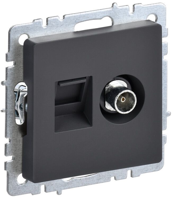 Розетка РТВ/РК12-БрГ графит предназначена для организации точек подключения телевизионного сигнала и локальной сети в одной установочной коробке. Подходит для квартир, домов, гостиниц, офисов и других объектов, где необходимо минимизировать количество отдельных розеток. Устройство позволяет подключить телевизор через коаксиальный кабель и компьютер или IPTV-приставку через Ethernet-кабель CAT5e.