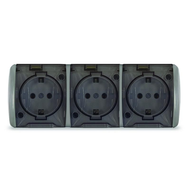 Розетка наружная трехместная с прозрачной крышкой, с заземлением, открытого монтажа, 16А, 220В, IP54, серая от бренда Universal (артикул к2235-gr) предназначена для надежного подключения бытовых и профессиональных устройств на улице или в помещениях с повышенной влажностью. Прозрачная крышка защищает контакты от пыли и влаги, а корпус из прочного пластика выдерживает перепады температур.