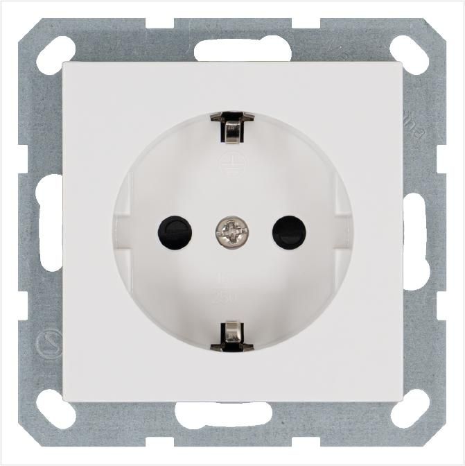 Эта розетка используется для подключения электрооборудования, требующего заземления - например, компьютеров, стиральных машин, микроволновок, сварочных аппаратов и другого оборудования с трёхконтактной вилкой стандарта Schuko. Благодаря защитным шторкам она безопасна в домах с детьми. Устанавливается в стеновые коробки стандартного размера, совместима с большинством европейских и российских систем монтажа.