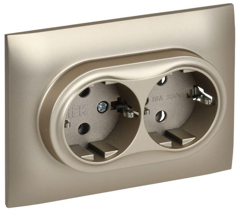 - Розетка 2-местная с заземлением без защитных шторок 16А в сборе шампань от IEK (ИЭК) - отличный выбор, если нужна эстетика и надёжность без лишнего функционала