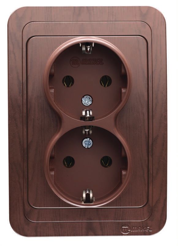 Розетка двойная с заземлением 16А/10А IP20 орех скрытой установки от бренда Makel, артикул 24082 из серии Mimoza - надёжное решение для внутренней проводки в жилых и офисных помещениях, где требуется подключение двух устройств одновременно с безопасным заземлением.