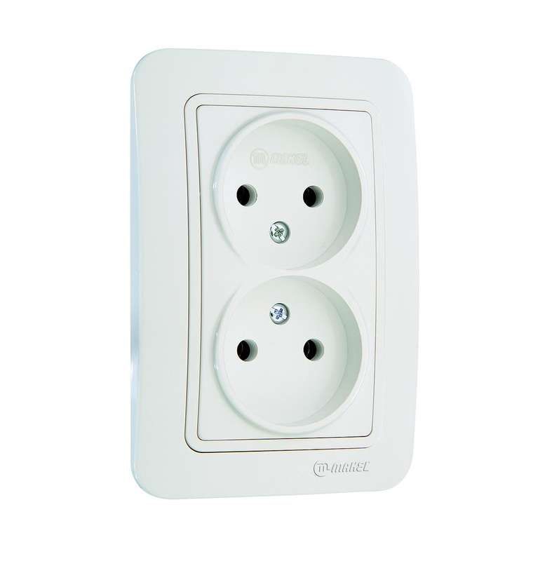 Розетка силовая (штепсельная) без заземления белая/белая 2-местная от бренда Makel, артикул 70017, предназначена для подключения бытовых и промышленных устройств с двухконтактной вилкой. Относится к серии Lillium и рассчитана на скрытую установку в стену.