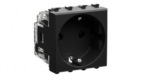 Розетка модульная 2P+E с заземляющим контактом, 2 модуля, черный матовый предназначена для установки в распределительные коробки и системы организации рабочих мест, совместимые с каркасами Avanti. Подходит для монтажа в офисах, мастерских, производственных участках и жилых помещениях, где требуется эстетичное и надёжное решение для подключения оборудования. Устройство работает в сетях с напряжением до 230 В и током до 16 А.