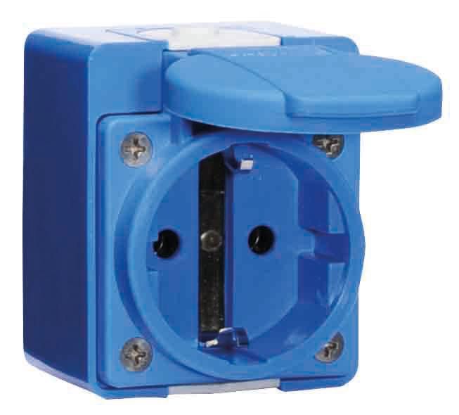 Изделие соответствует требованиям международного стандарта IEC 60884-1 для розеток с заземлением. Наличие крышки предотвращает случайное прикосновение к токоведущим частям. Материал корпуса самозагасающий - не поддерживает горение. Цветовая маркировка (синий) не влияет на электробезопасность, но помогает визуально отделить эту розетку от других в распределительном щите или группе устройств.