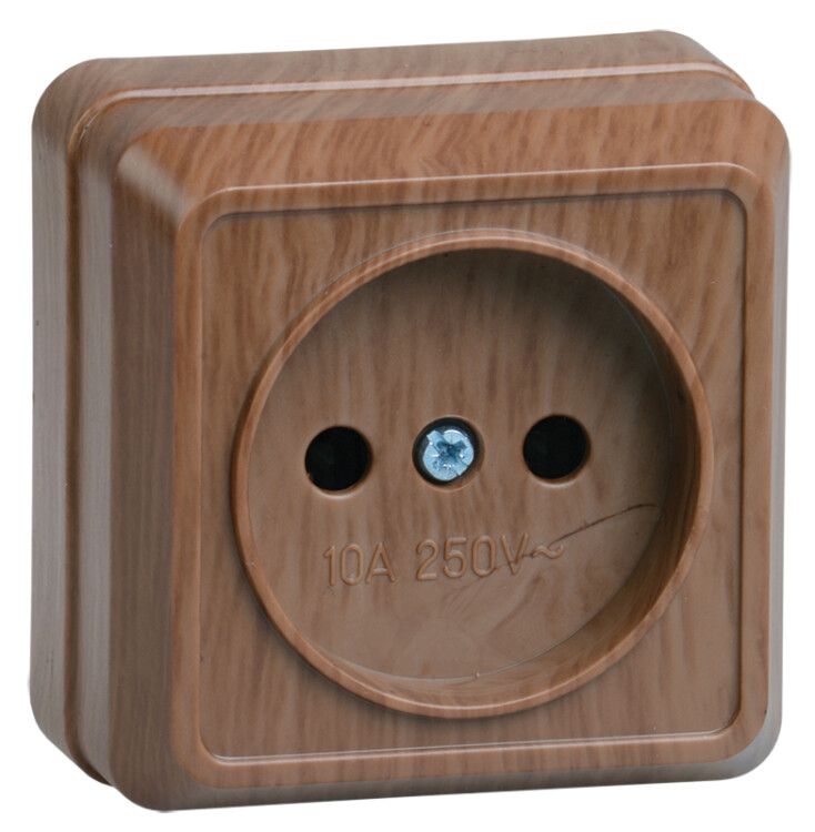 Розетка 1-местная без заземления 10А открытого монтажа дуб предназначена для подключения одиночных однофазных потребителей переменного тока с напряжением до 250 В и частотой 50 Гц. Подходит для устройств мощностью до 2,5 кВт - например, настольных ламп, зарядных устройств, телевизоров, фенов, кофеварок. Устанавливается в жилых комнатах, офисах, кладовых и других сухих помещениях, где нет требований к защите от утечки тока через корпус.